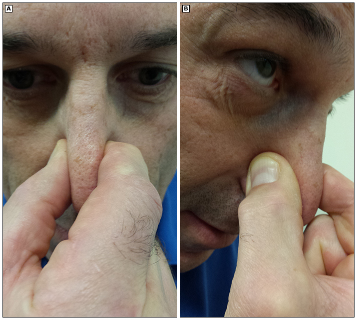 2. Pinch the soft area on both sides toward the bottom of your nose, below the bone (see image below). Do not grip the bridge of your nose between your eyes. Do not press on just 1 side, even if the bleeding is only on 1 side.