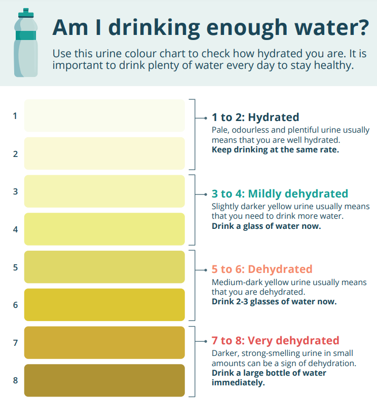 Note that the colours in this chart may appear different depending on the computer screen used or printer settings. The colours on this chart should only be used as a guide and should not replace the advice of a health professional. Speak to your doctor if you are worried about the colour if your urine, the amount of water you drink or dehydration