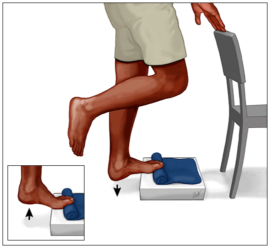 Curl your toes around the edge of a book. Then, straighten them. Repeat over and over for 2 minutes, 2 times each day. Source: https://www.uptodate.com/services/app/contents/graphic/view/PI/56422/ToeCurlsPI.jpg