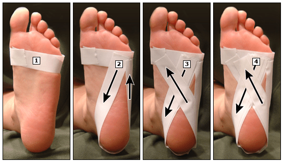 Step 4: Repeat step 3. The tape does not need to align perfectly. The tape can stay in place for 1 week. Source: https://www.uptodate.com/services/app/contents/graphic/view/PI/53721/FoottapingPI.jpg