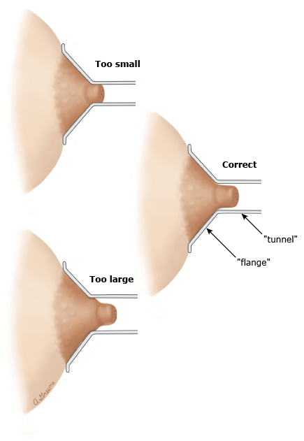 - Make sure the cone-shaped pieces that fit over the breasts are the right size. These pieces are called “flanges.” Your nipple should not rub against the tunnel part of the flange (see picture below)